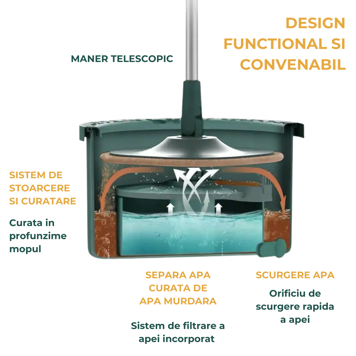Descoperă setul nostru inovator de găleată și mop, creat pentru o curățenie impecabilă! Cu orificii speciale pentru separarea apei curate de cea murdară, faci curățenie mai igienic și mai eficient. Simplu, rapid și comod – pentru o casă mereu strălucitoare!