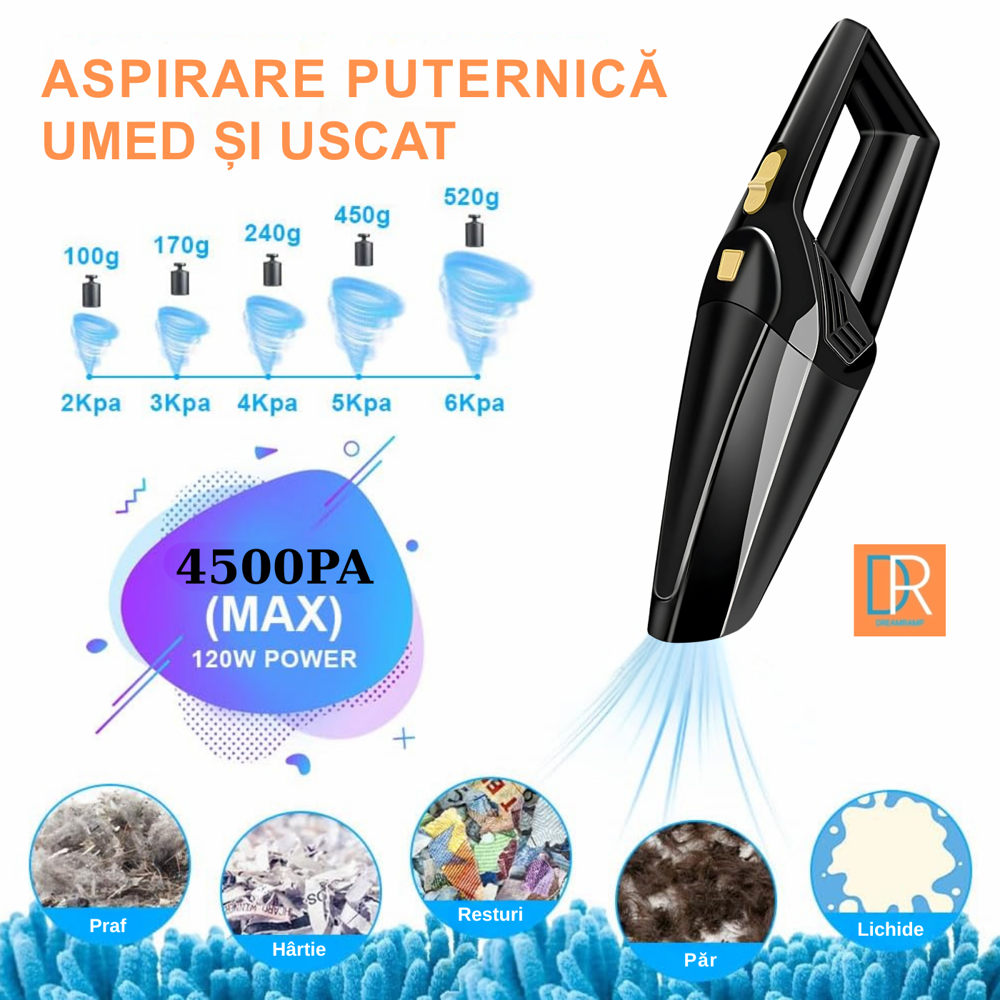 DreamRamp® Portable Car Vacuum Cleaner, 4500Pa High Power Cordless Mini Compact HEPA Fast Cleaning for Car SUV Caravan Ergonomic Rechargeable Accessories for Dust Crumbs Pet Hair Black