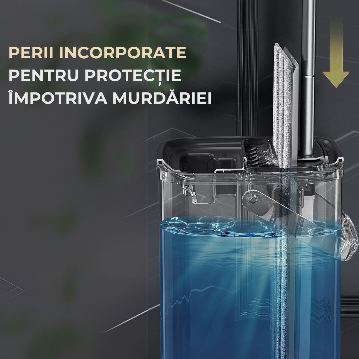 The integrated system is specially designed for flat mops, allowing excess water to be removed without having to touch the reservoir with your hand.