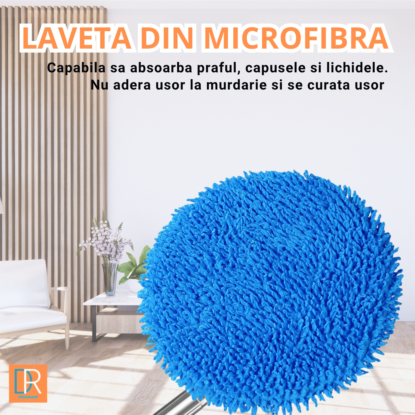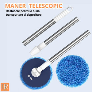✅ Mâner telescopic reglabil – Confortul tău contează. Tija mopului este extensibilă, ajustabilă la înălțimea dorită, astfel încât să poți curăța podeaua, geamurile sau chiar tavanul fără să te apleci sau să te urci pe scară.
