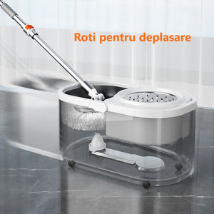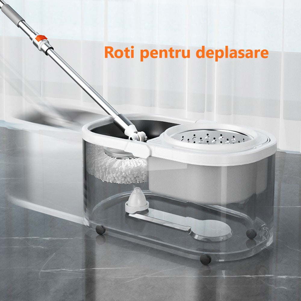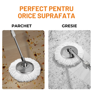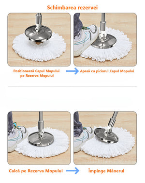 Sistemul de stoarcere rotativ permite curățarea eficientă a mopului, iar pachetul include două rezerve din microfibră pentru utilizare îndelungată.