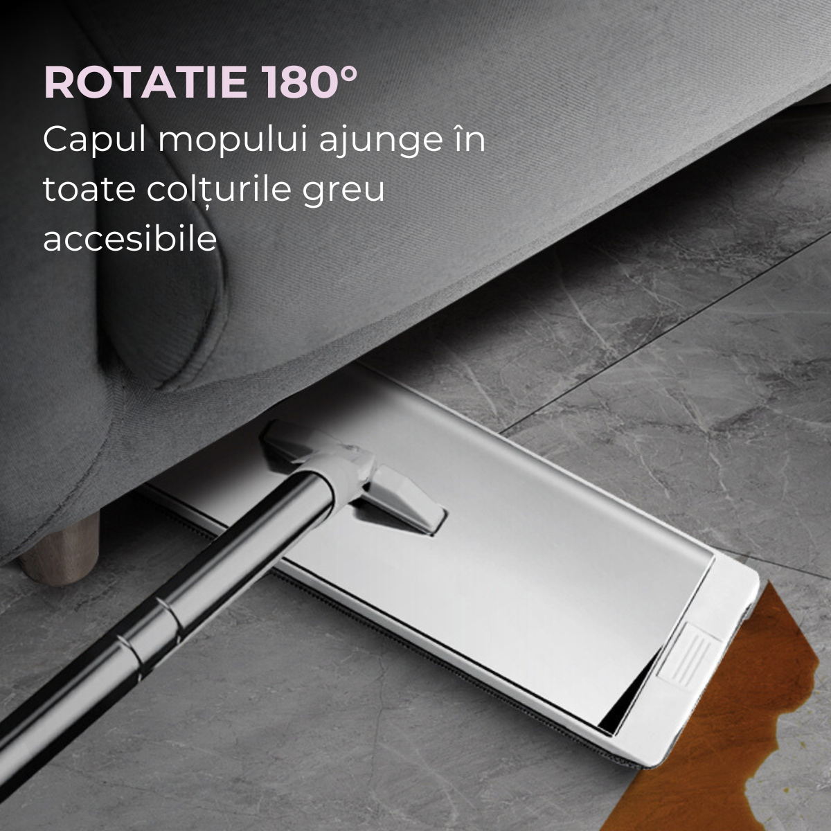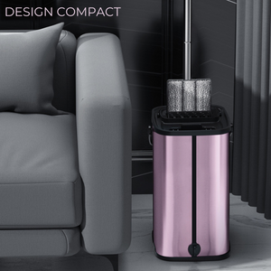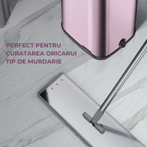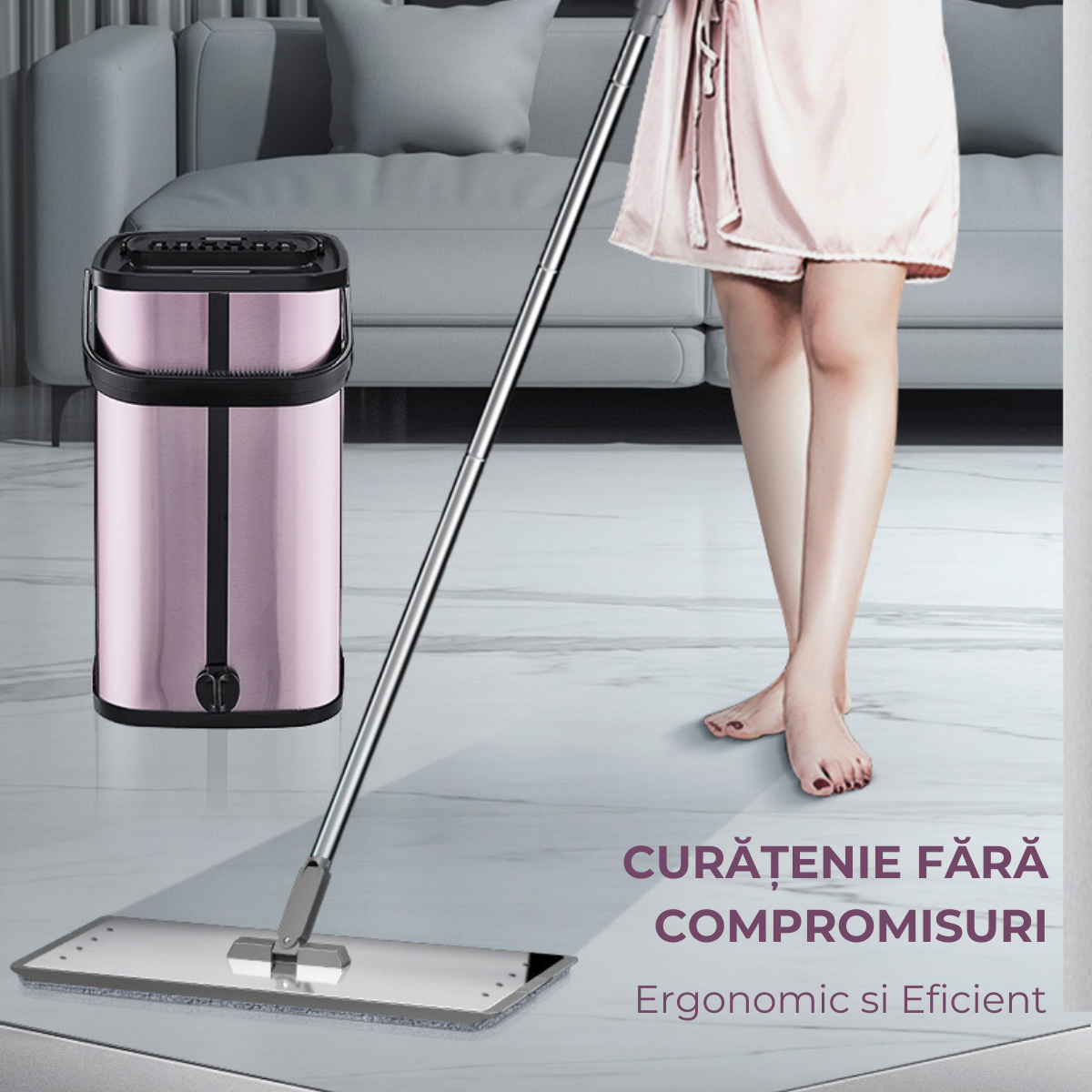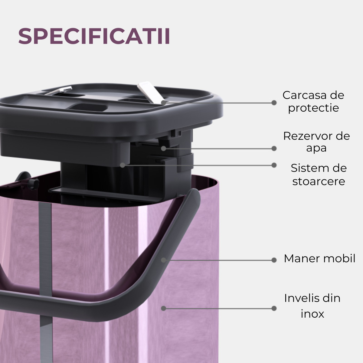 Set DreamRamp galeata mop cu centrifuga din inox galeata dreptunghiulara roz, finisaj lucios si orificiu de scurgerea a apei cu doua rezerve