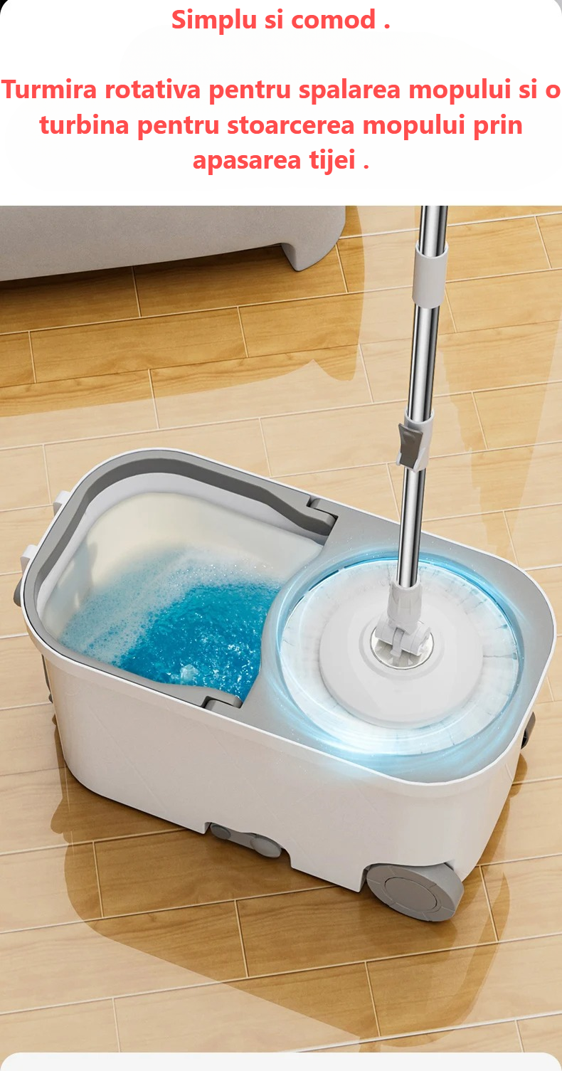Permite spălarea și stoarcerea rapidă a mopului, reducând timpul necesar curățeniei.
